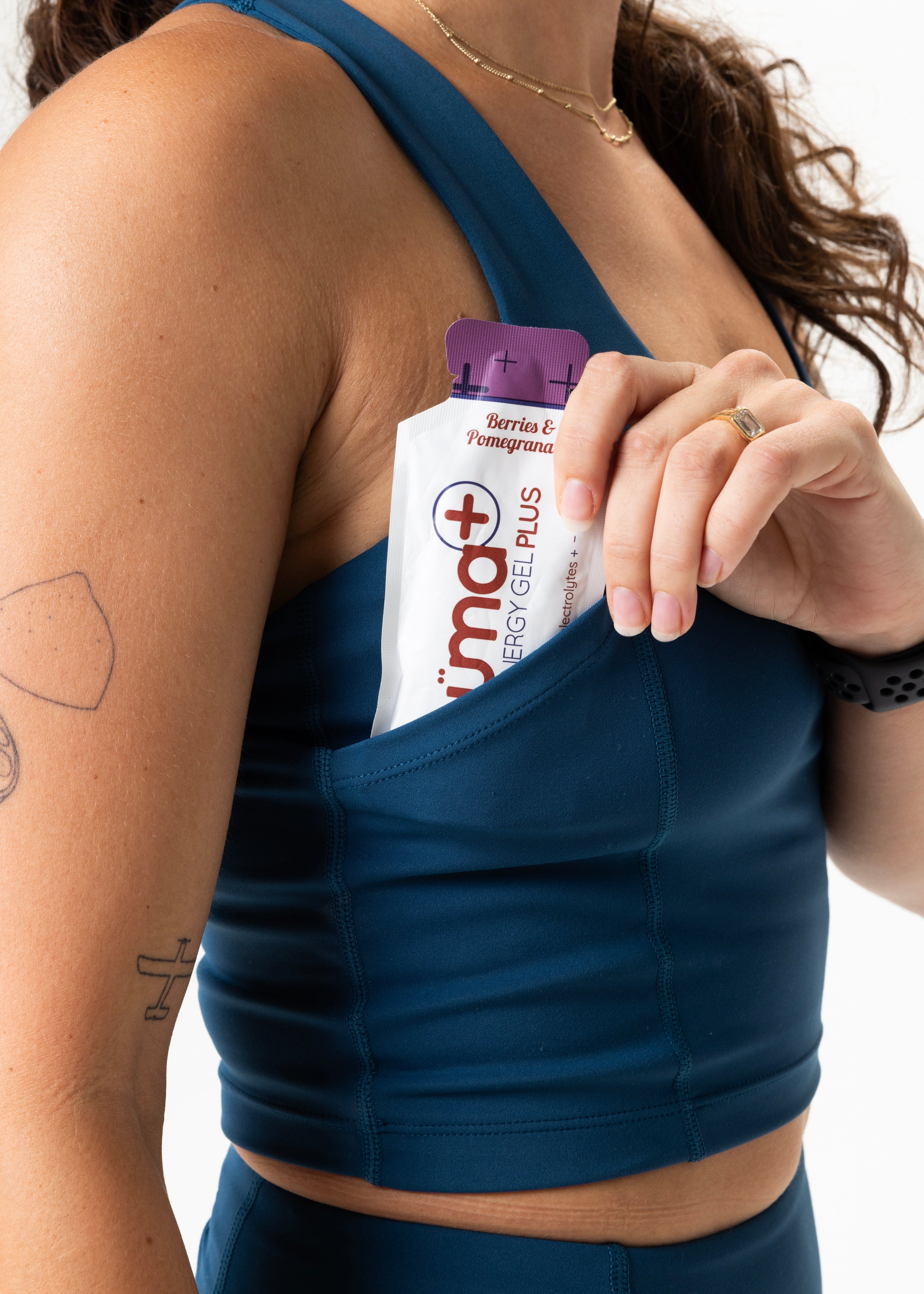 The Rebel compression race crop top comes with a built-in sports bra. Featuring a stylish and athletic cut that flatters your physique while providing optimal support and performance. Our compression material allows a slim fit that hugs your body without feeling tight. With removable pads and multiple pockets for your phone, nutrition, and more, this is the ideal top for long runs and races.