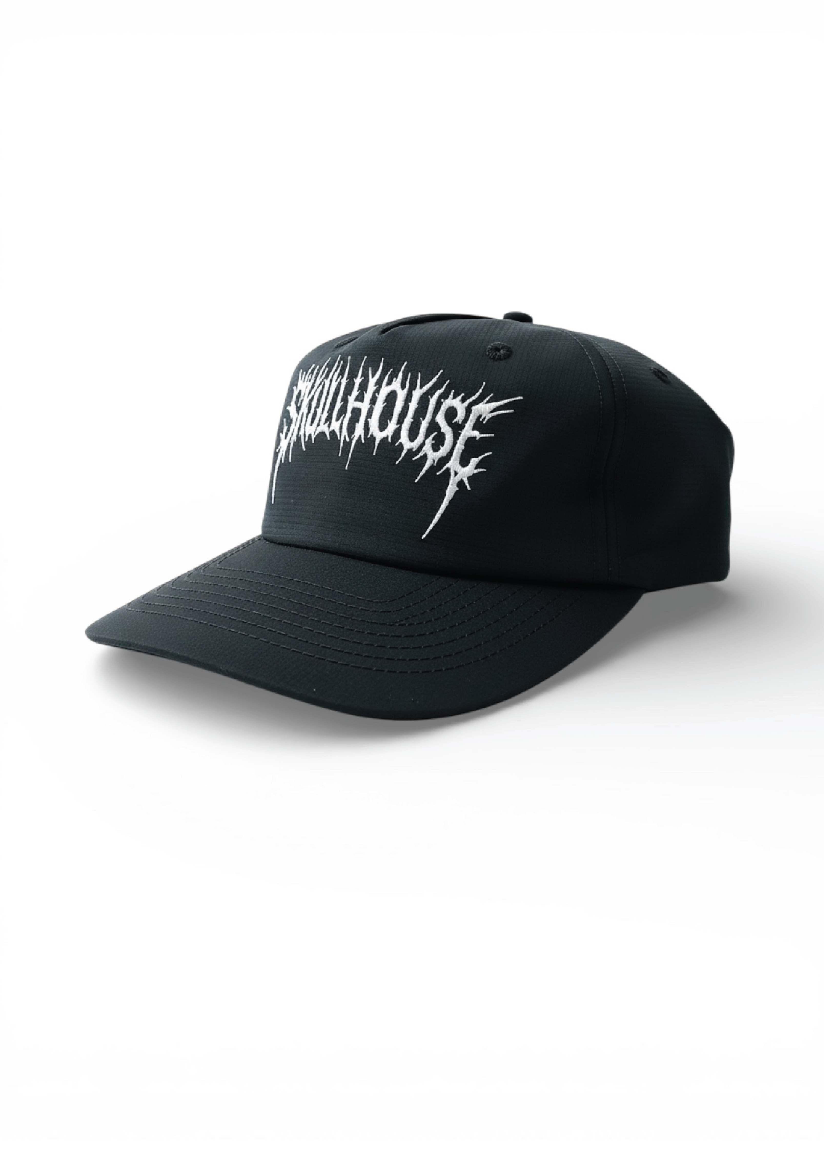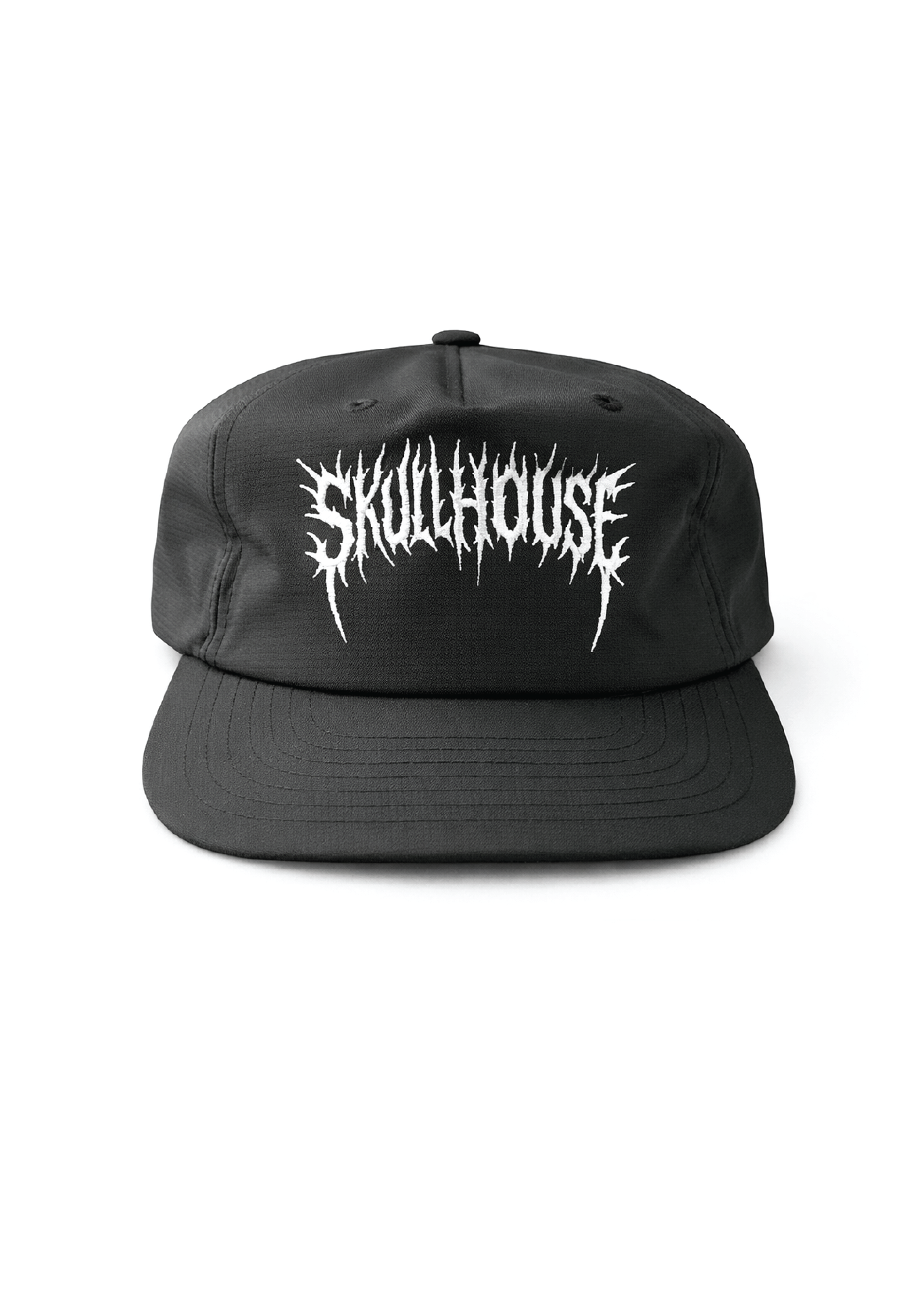 Finished with a custom Skull House heavy metal–inspired embroidered logo on the front panel. Aggressive lettering against clean technical fabric.